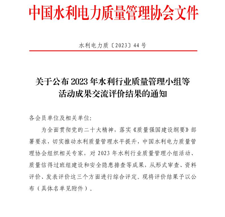 公司2023年度水利行業質量管理小組榮獲一等成果